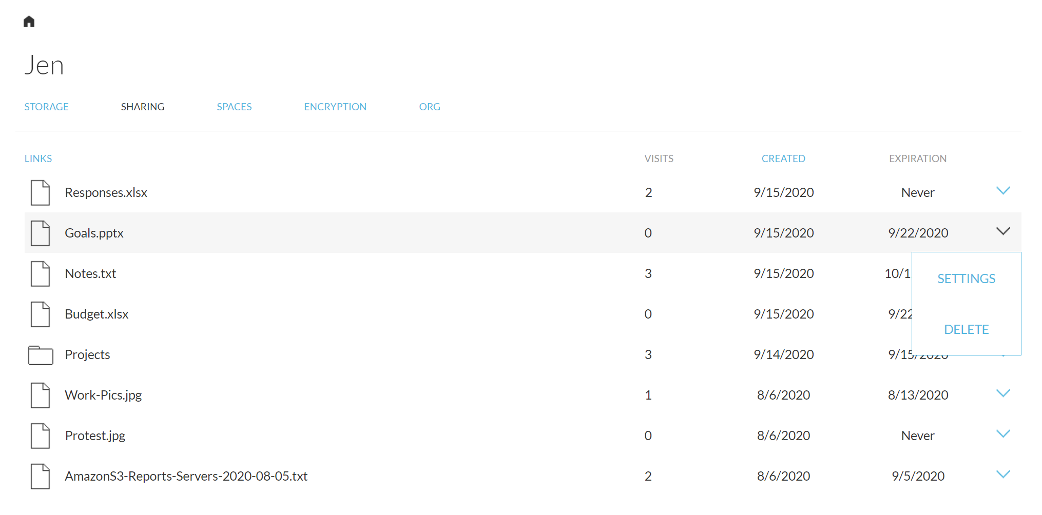 The dropdown menu has a SETTINGS option which you can use to change the password you've set or to set a new expiration date. Additionally, you can view what the current share link URL is again so you can copy-and-paste it for further sharing.