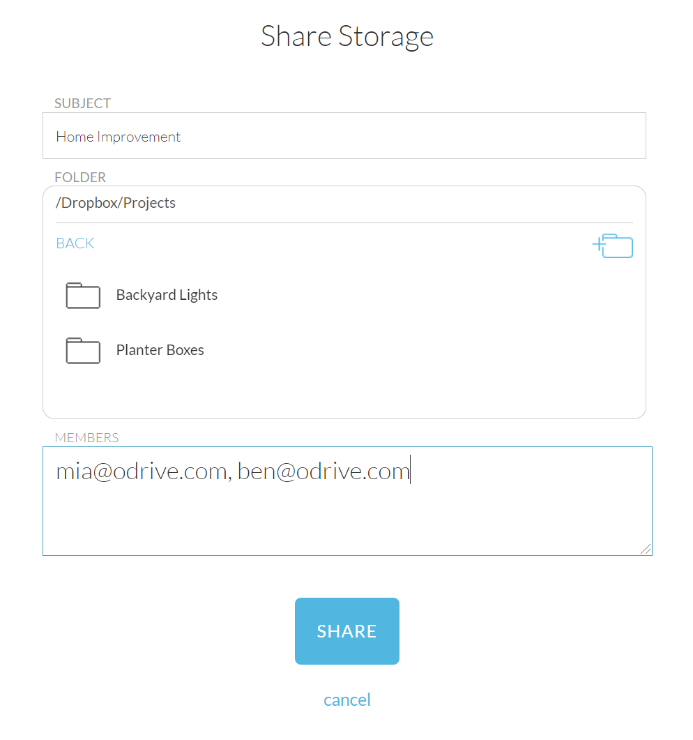 Use the + Share Storage button to create a new Space to share. You'll be able to give the Space a name, pick a specific folder in any linked storage to share, and specify the email addresses of people you want to invite.