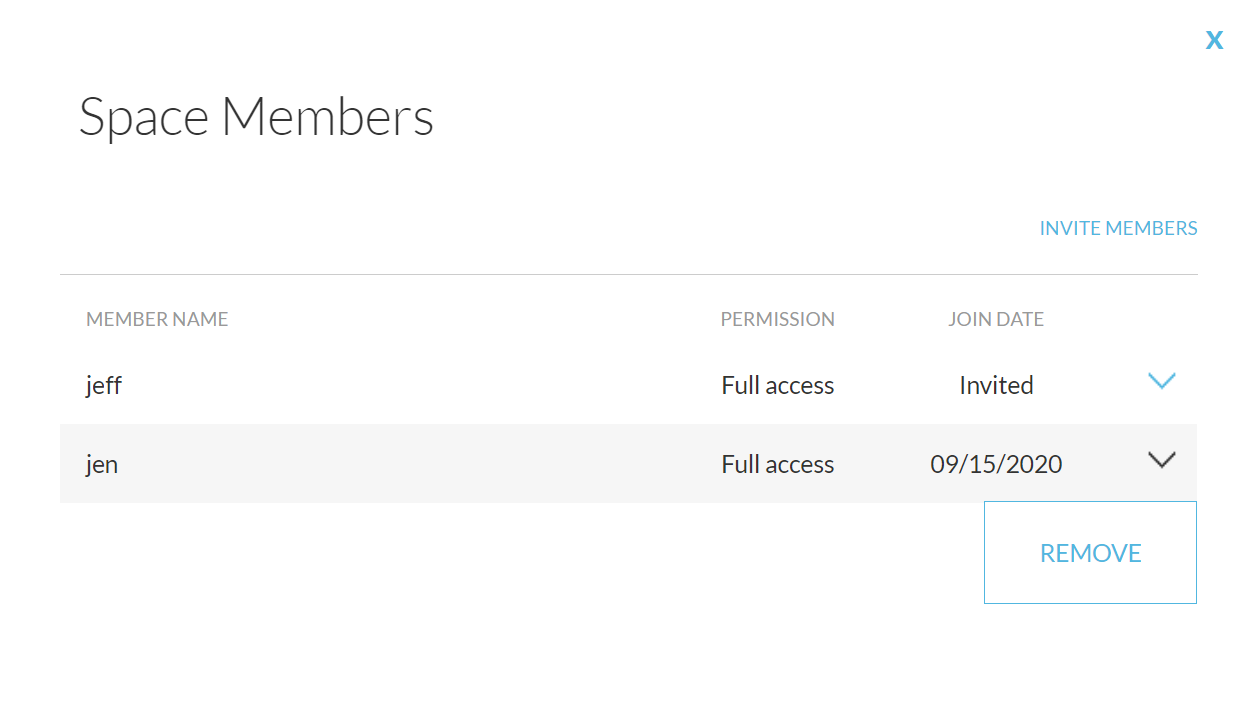 Selecting the MEMBERS option from the dropdown menu will open up a pop-up dialog which lets you invite new members, remove an existing member, and view member join dates.