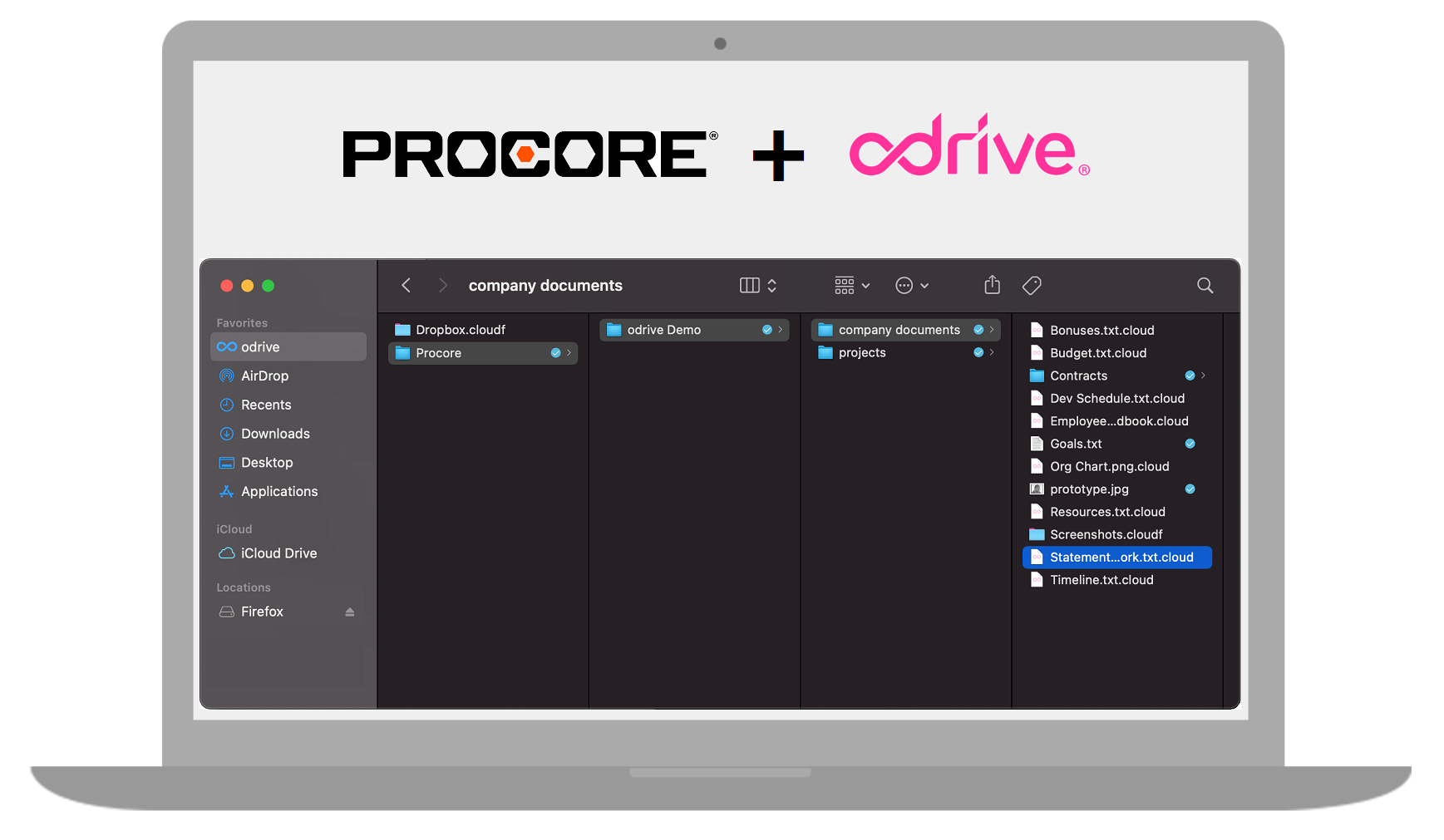 Collaborating over documents with a diverse set of stakeholders plays a significant role in making your construction projects successful. With odrive, you can bring even more value to files in Procore Company Documents and Project Documents repositories by making them more accessible to you, your team, and any outsiders that you work with.