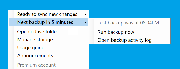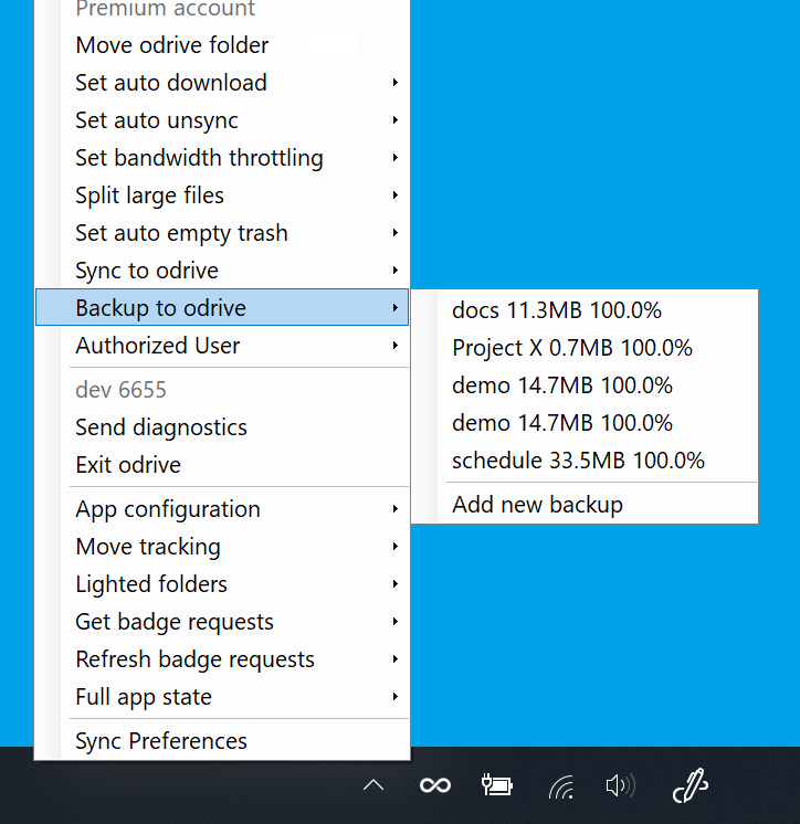 You can select the Backup to odrive option from the odrive tray menu to bring up a list of your current backup jobs.
