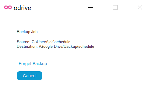 As shown in the previous section, you can list your backup jobs from the tray menu by going to the Backup to odrive option. Selecting a particular backup job will bring up a dialog for you to confirm the source and destination folders. If this is the backup job you want to delete, select the Forget Backup option in the dialog.