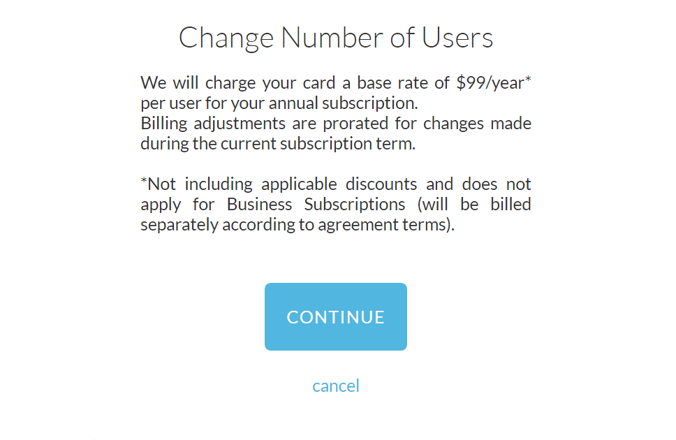 For billing processing, a separate invoice will be issued with the correct contract values. This is why theChange Number of Userspop-up dialog mentions the discrepancy for business users. Unfortunately, the webapp is disconnected from our business subscription invoicing system so we are unable to present the specific terms for your specific contract here in the pop-up dialog when you are making your changes.