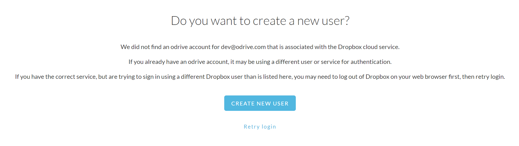 The user can click on the SIGN IN & LINK ORG button anyway to create a new user through the sign in flow. When they finish authenticating with their chosen sign-in provider, odrive will detect that their user doesn't exist and display a standard confirmation message:
