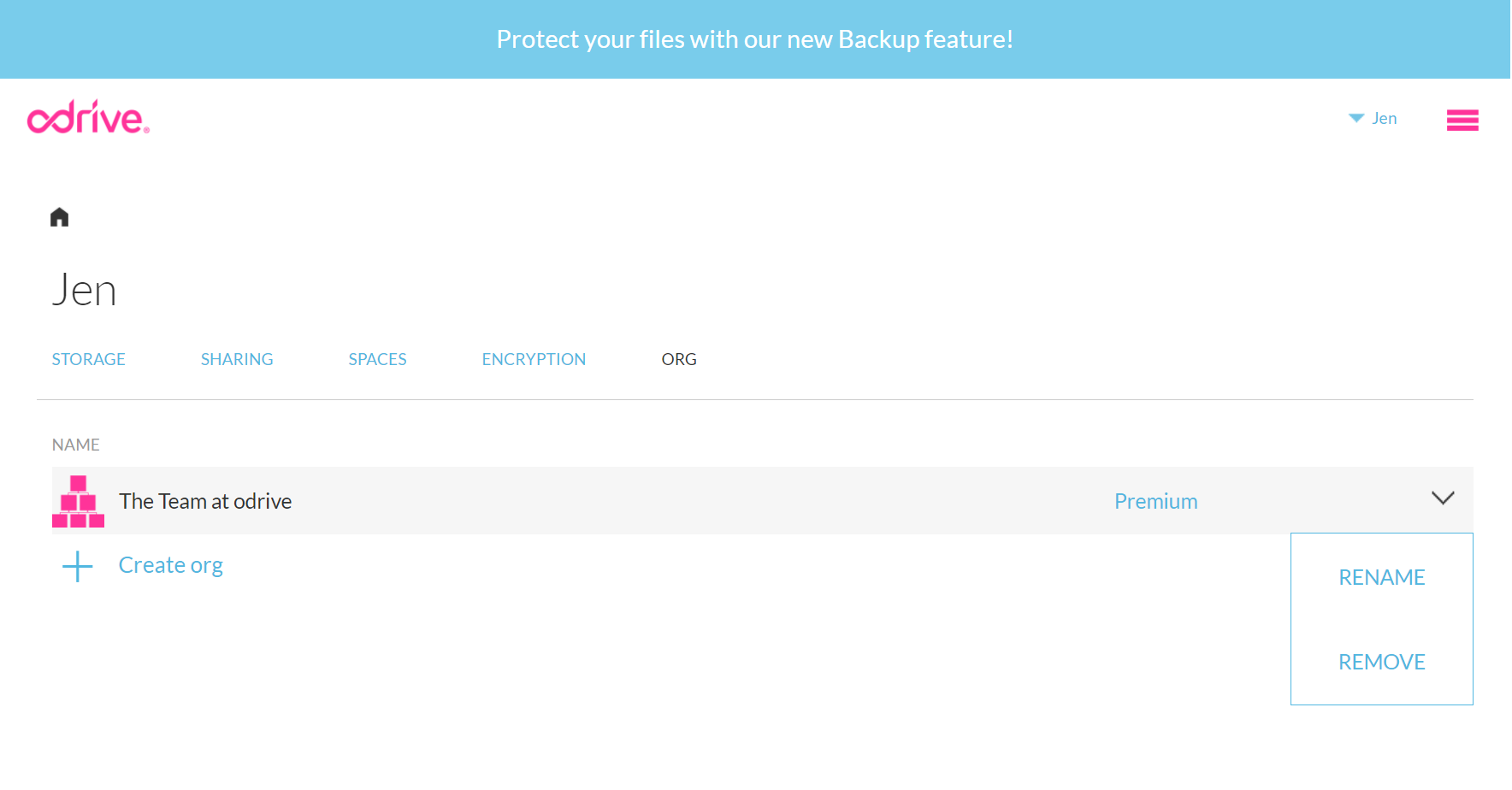 The Org list in your odrive home also has dropdown menu options which you can use. You can select the RENAME option to give your Org a new name.