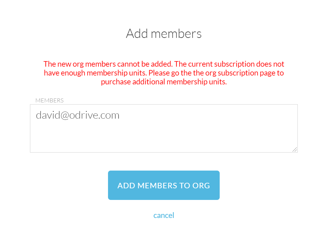 If the number of people you are inviting exceeds your subscription count, you will see a message such as the one below when you click to ADD MEMBERS TO ORG.