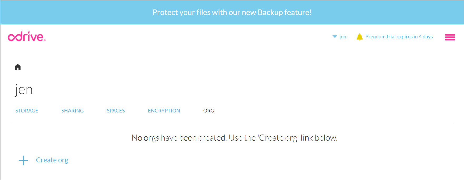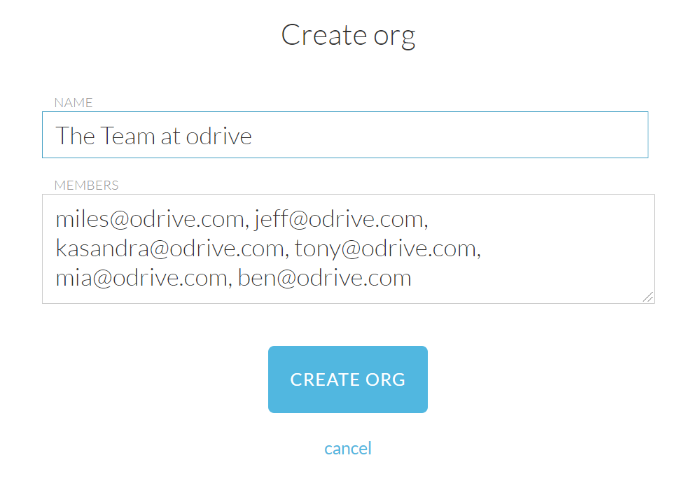 Go to the ORG tab of your odrive home on the web client and click on the + Create Org link.