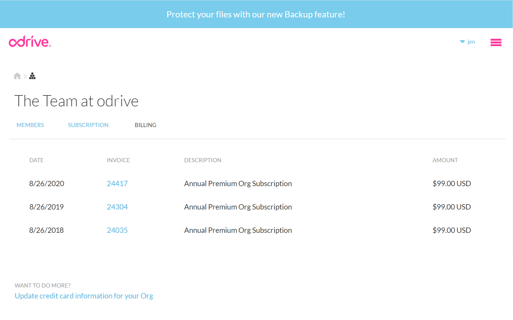 - Billing management. View past charges and invoices, and update the credit card details for the Org.