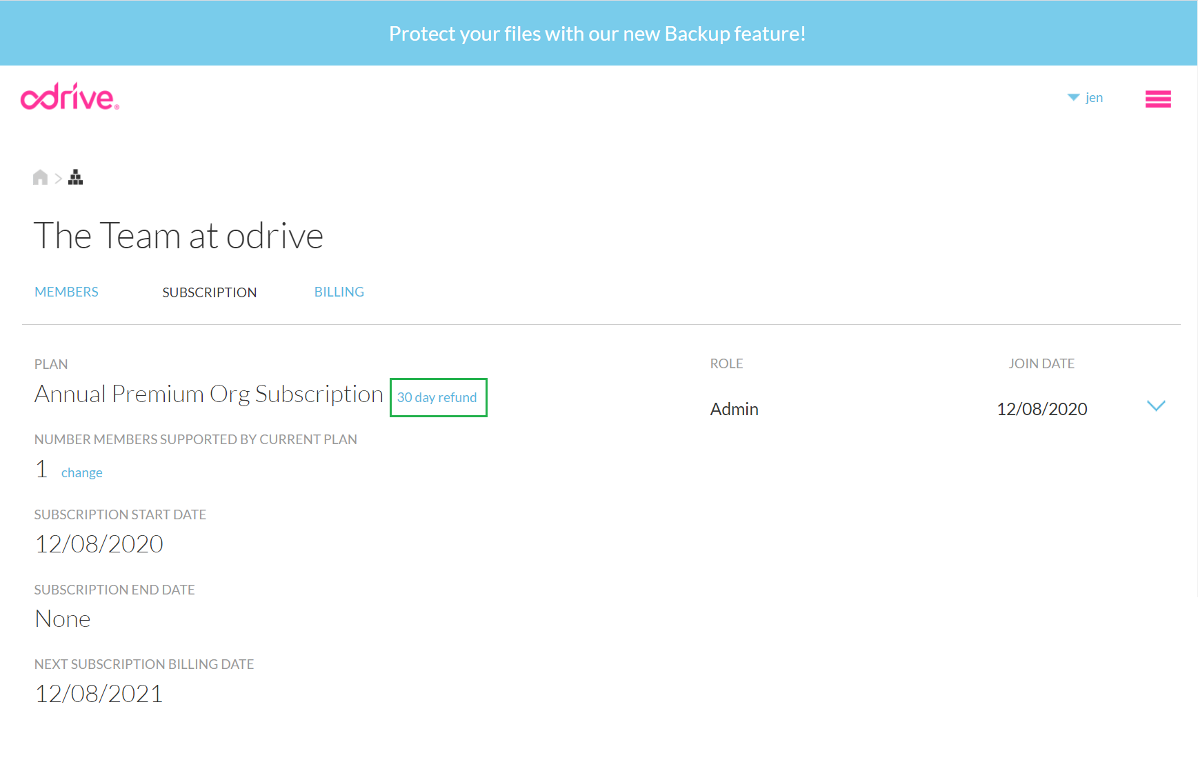 For first time purchases, you can cancel anytime within 30 days for a full refund. If your subscription qualifies, you will see a "30 day refund" link next to the "Annual Premium Org Subscription" entry under PLAN. Otherwise, the link will say "Cancel autorenewal".
